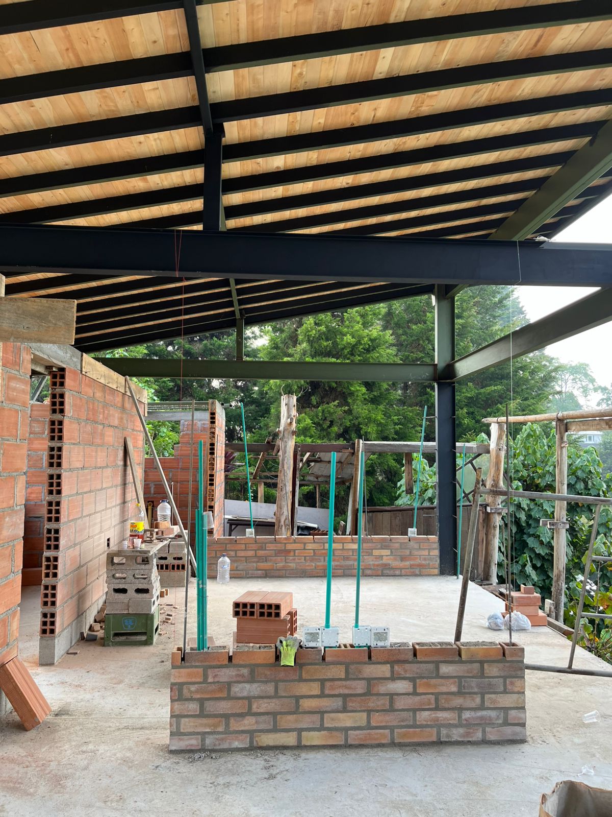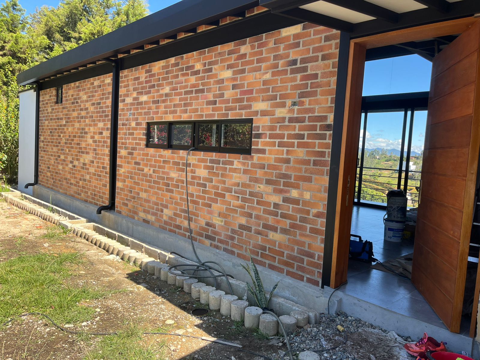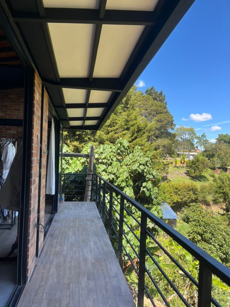 Construimos espacios resistentes, eficientes y diseñados a la medida de cada cliente. Algunas características en esta casa son columnas y vigas metálicas, ladrillo estructural alrededor y adobe para divisiones, la cubierta en acero con tablilla y teja shingle.