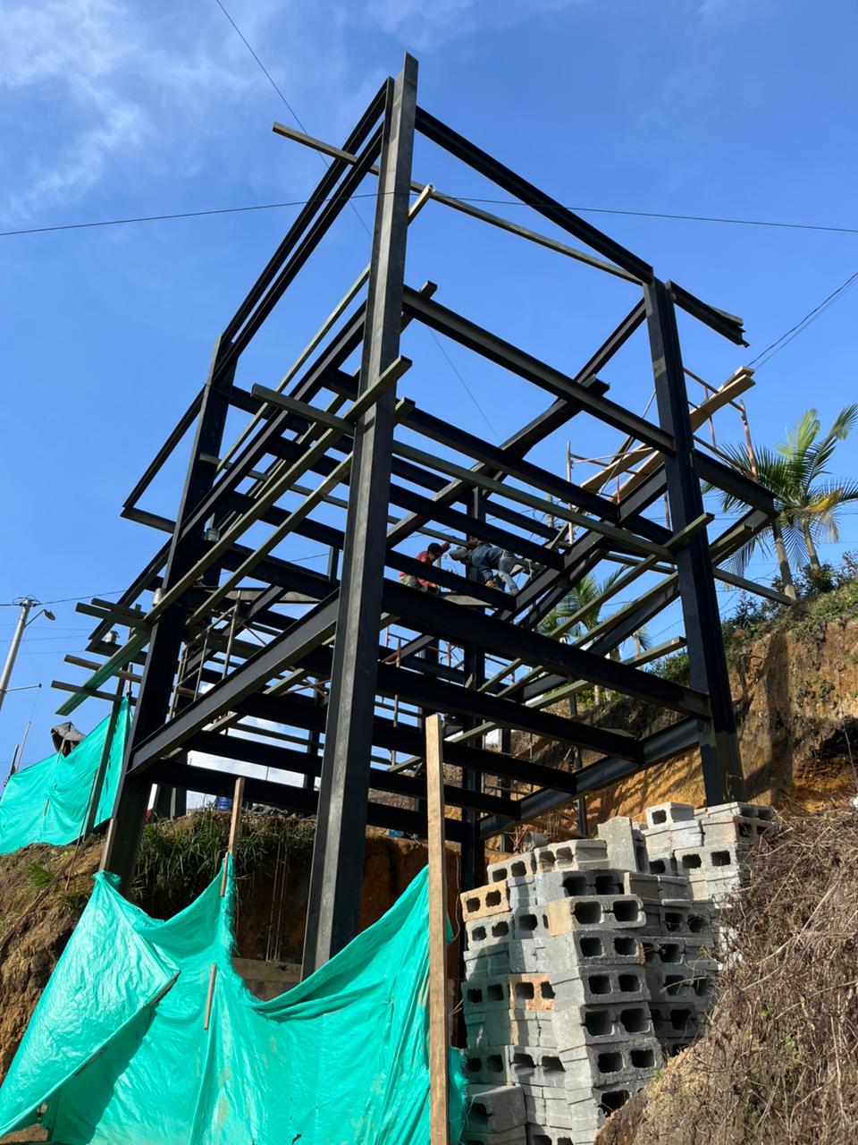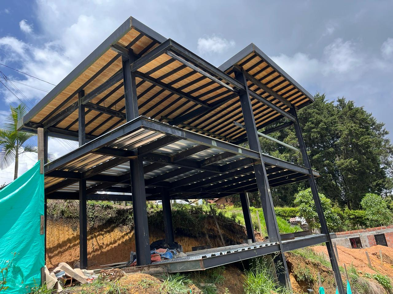 Se optó por 7 columnas en ipe 300 con altura de 9 metros y vigas en acero, en la parte inferior va el parqueadero,  segundo nivel cocina y zona social y el tercer nivel habitaciones, son unas de nuestras creaciones porque estamos en el proceso desde el diseño hasta la parte final
